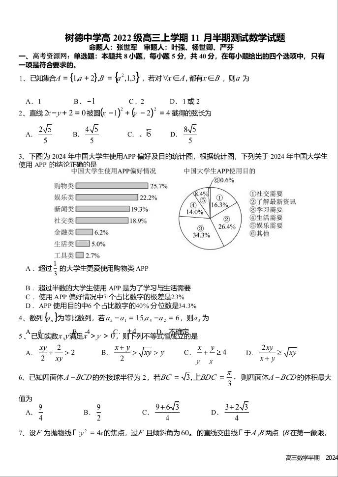 四川省成都市树德中学高2025届高三上学期期中测试数学及答案