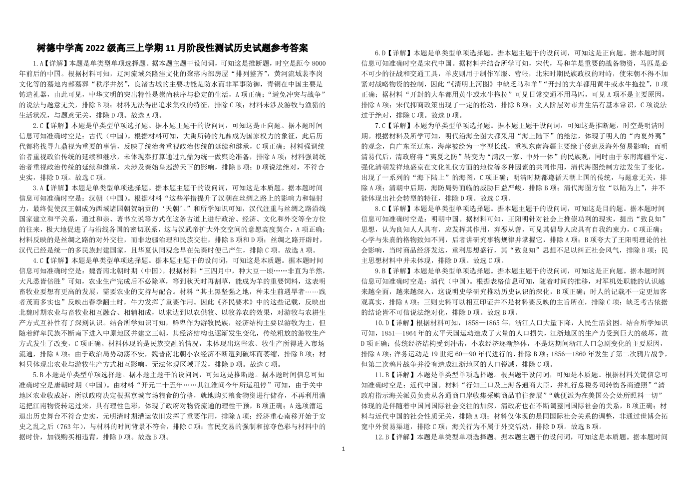 四川省成都市树德中学2025届高三上学期期中考试历史答案