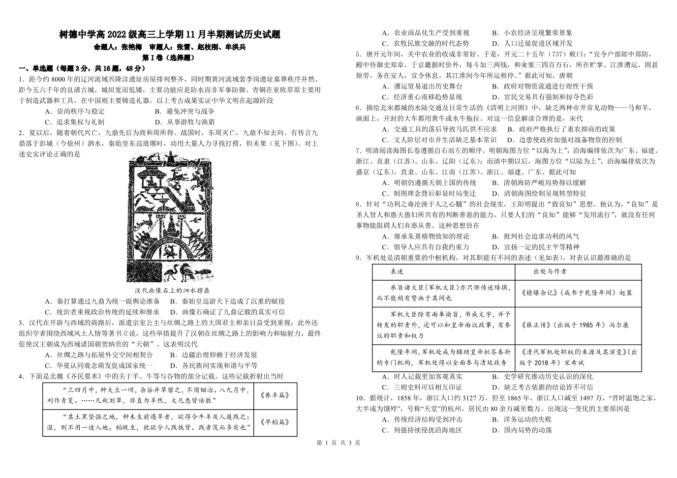 四川省成都市树德中学2025届高三上学期期中考试历史