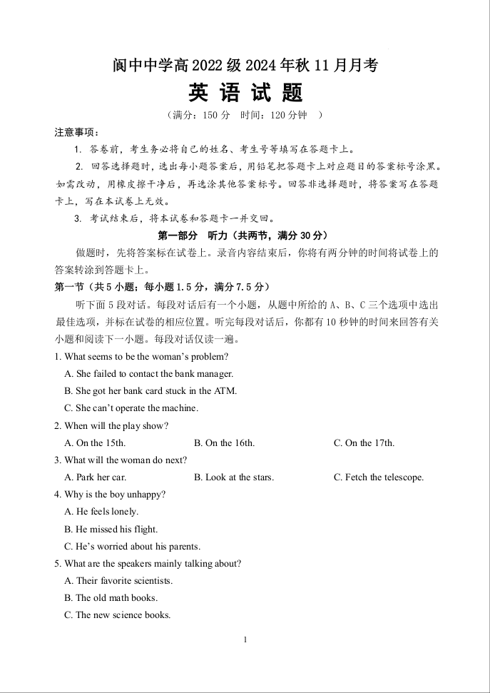 四川省南充市阆中中学2025届高三上学期11月月考英语