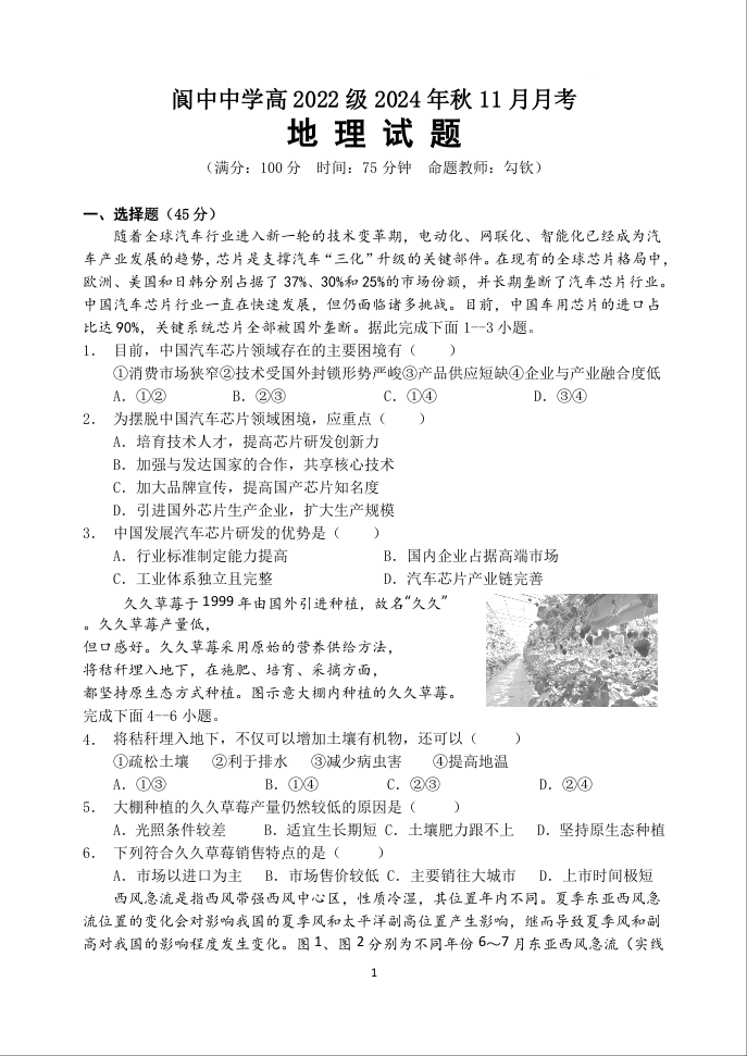 四川省南充市阆中中学2025届高三上学期11月月考地理
