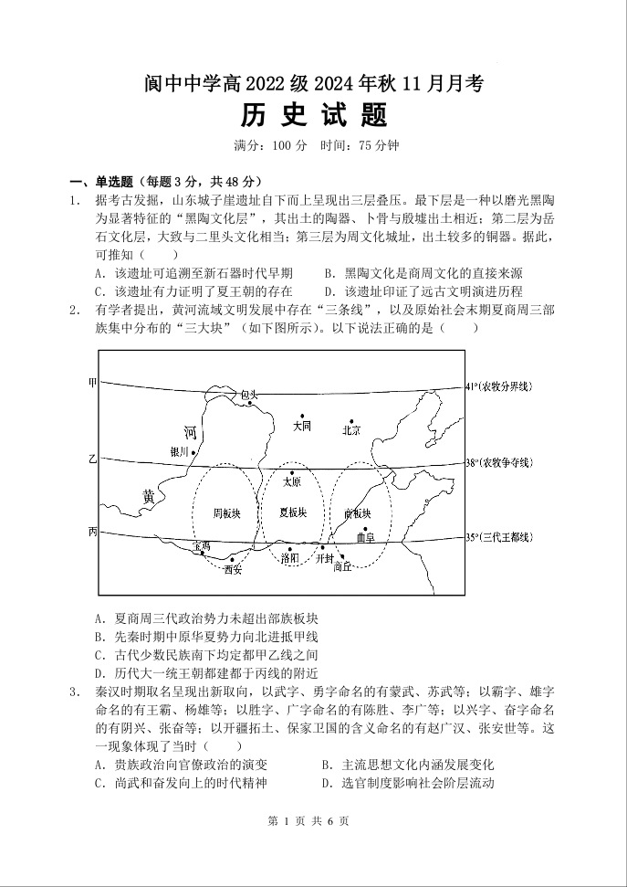 四川省南充市阆中中学2025届高三上学期11月月考历史