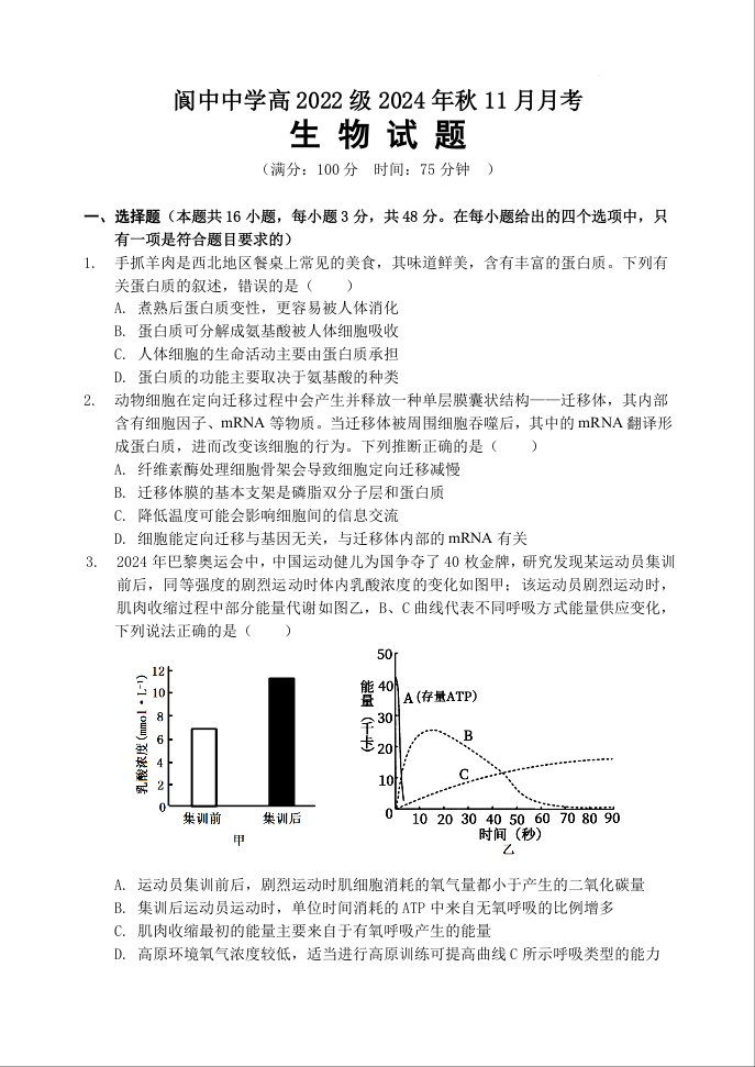 四川省南充市阆中中学2025届高三上学期11月月考生物