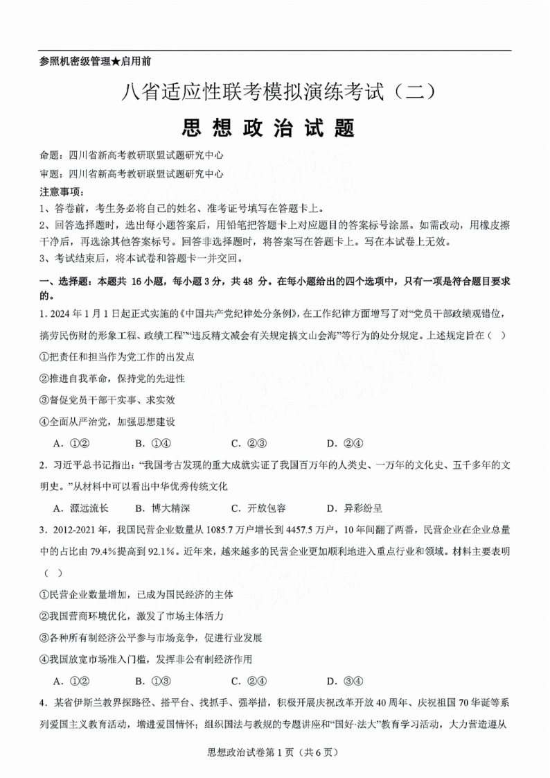 四川省新高考教研联盟2025届高三上学期八省适应性联考模拟演练考试(二)政治