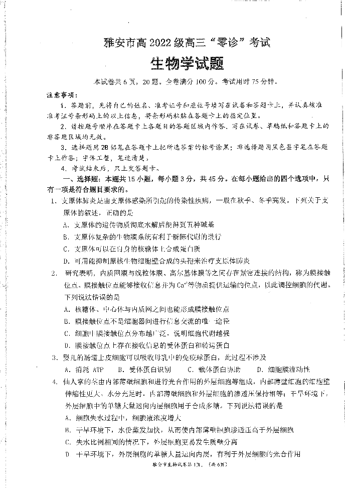 四川省雅安市22024-2025学年高三上学期11月零诊生物试卷