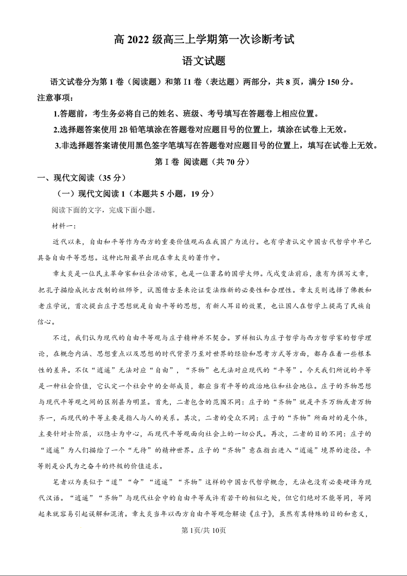 四川省宜宾市叙州区高2022级高三上学期第一次诊断性考试语文