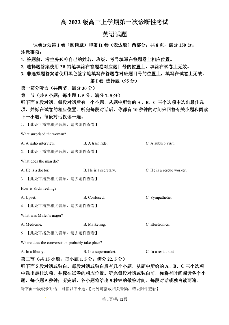 四川省宜宾市叙州区高2022级高三上学期第一次诊断性考试英语