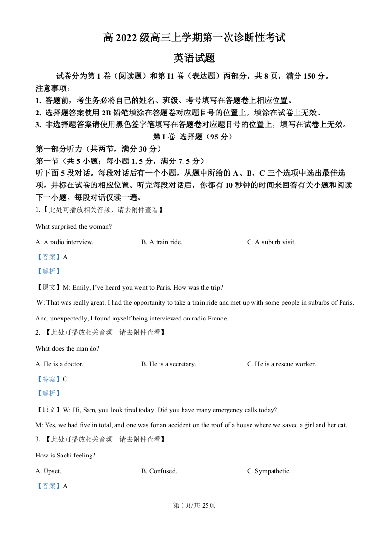 四川省宜宾市叙州区高2022级高三上学期第一次诊断性考试英语答案
