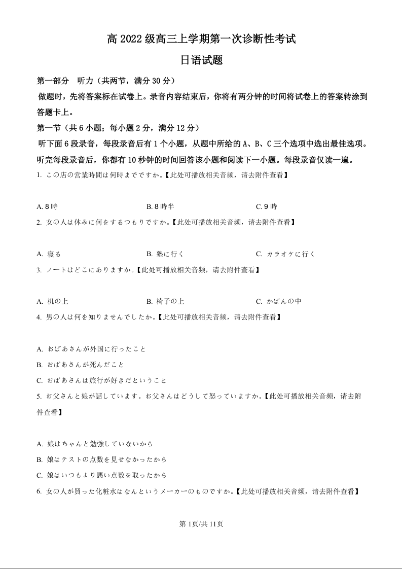 四川省宜宾市叙州区高2022级高三上学期第一次诊断性考试日语