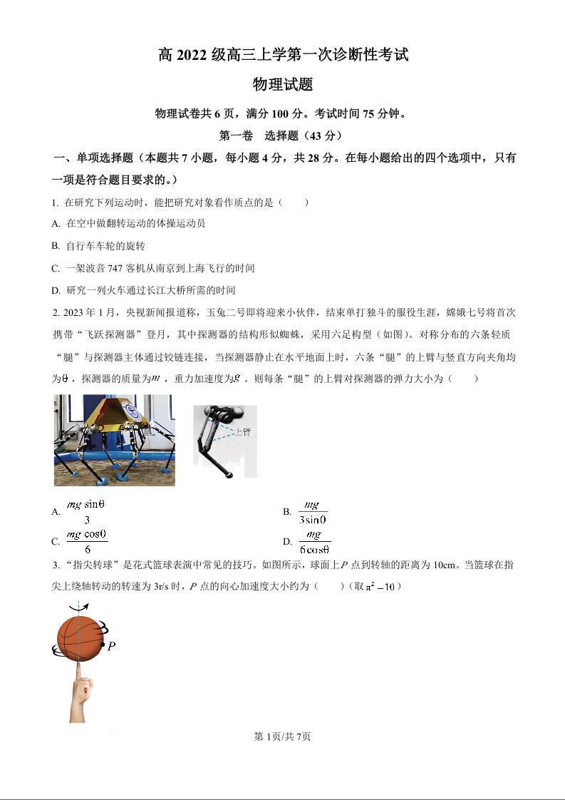 四川省宜宾市叙州区高2022级高三上学期第一次诊断性考试物理