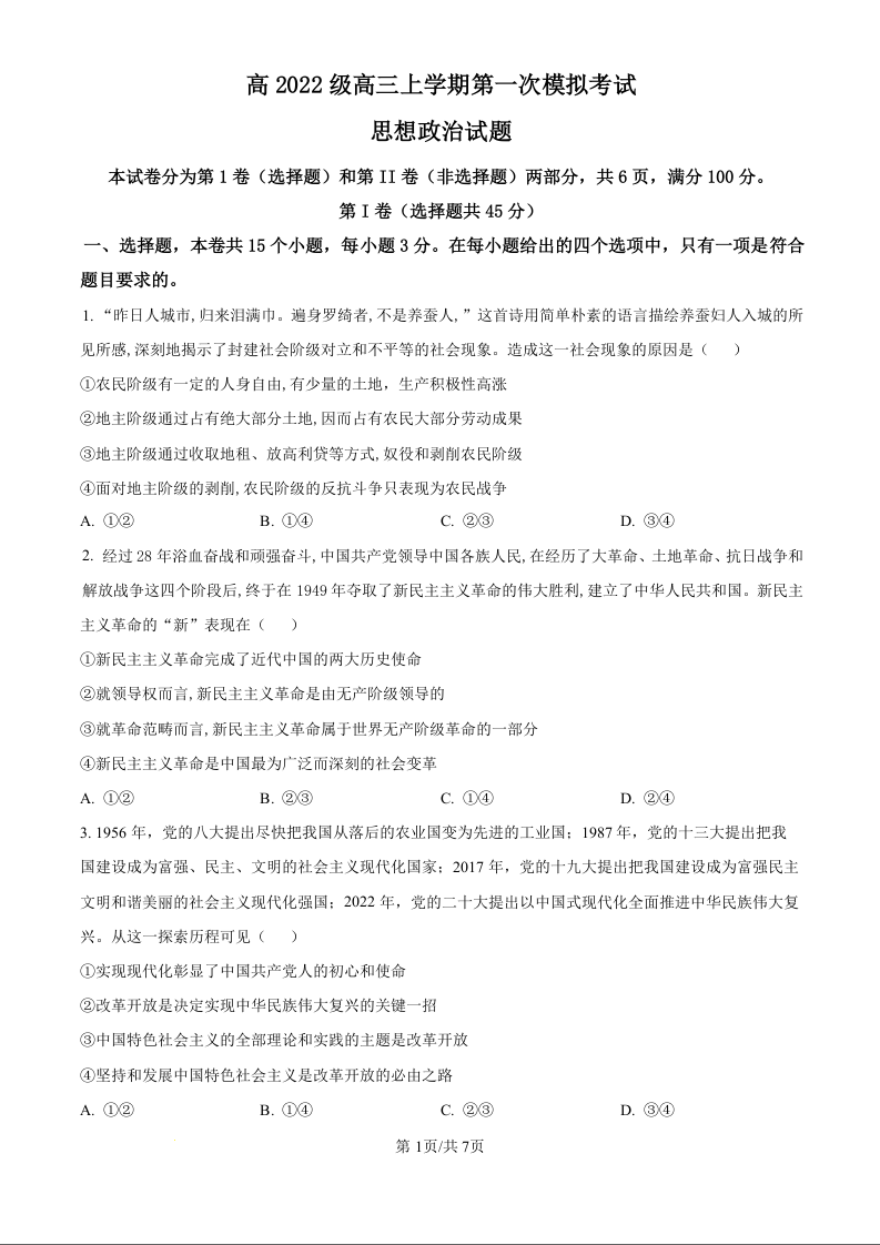 四川省宜宾市叙州区高2022级高三上学期第一次诊断性考试政治