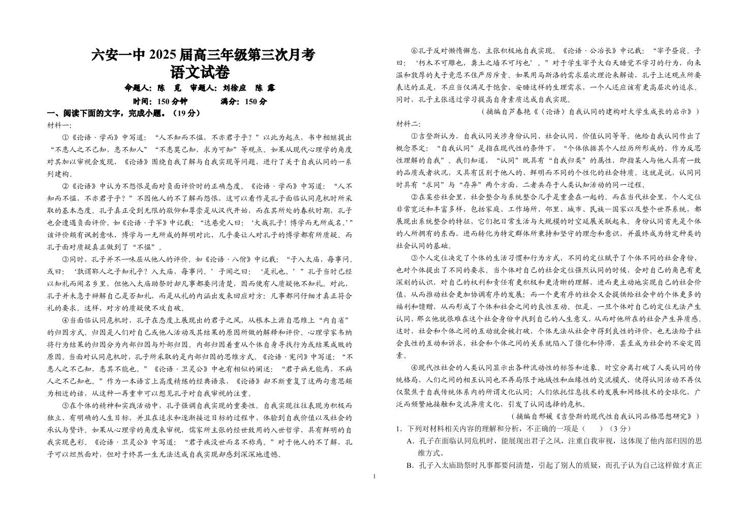 安徽省六安第一中学2025届高三上学期第三次月考(11月)语文+答案