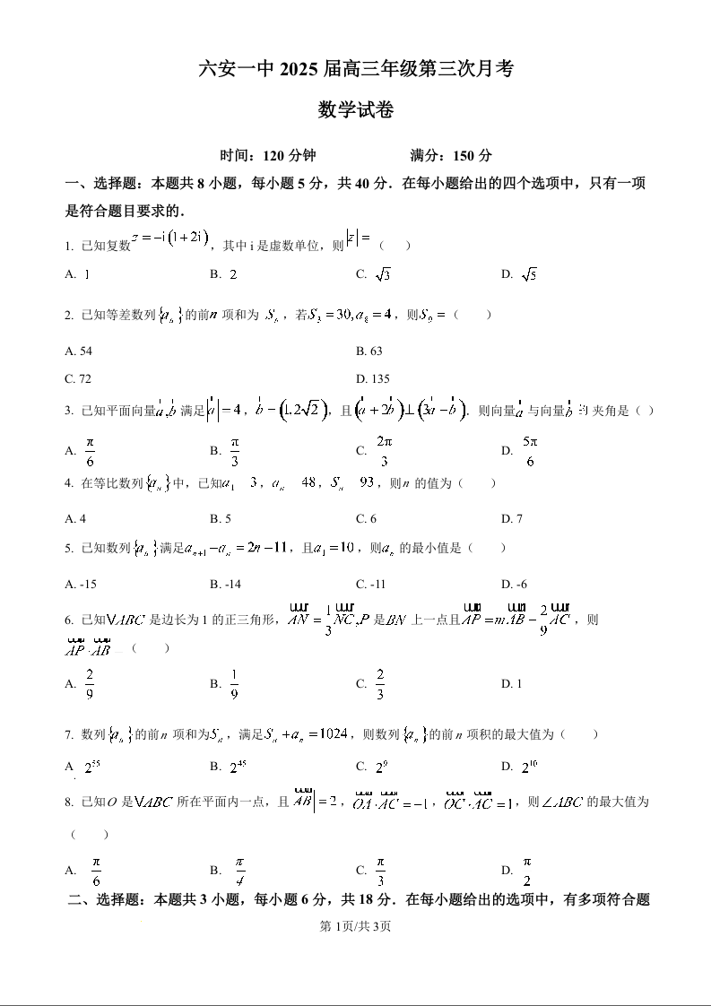 安徽省六安第一中学2025届高三上学期第三次月考(11月)数学(原卷版)