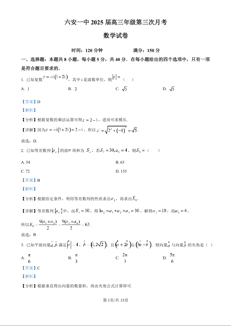 安徽省六安第一中学2025届高三上学期第三次月考(11月)数学(精品解析版)