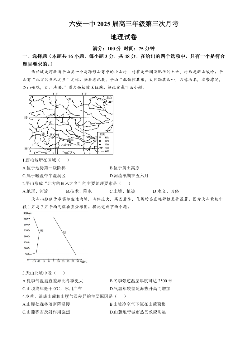安徽省六安第一中学2025届高三上学期第三次月考(11月)地理+答案