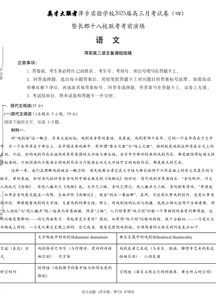 江西省萍乡实验学校2025届高三月考试卷(四)暨长郡十八校联考考前演练语文