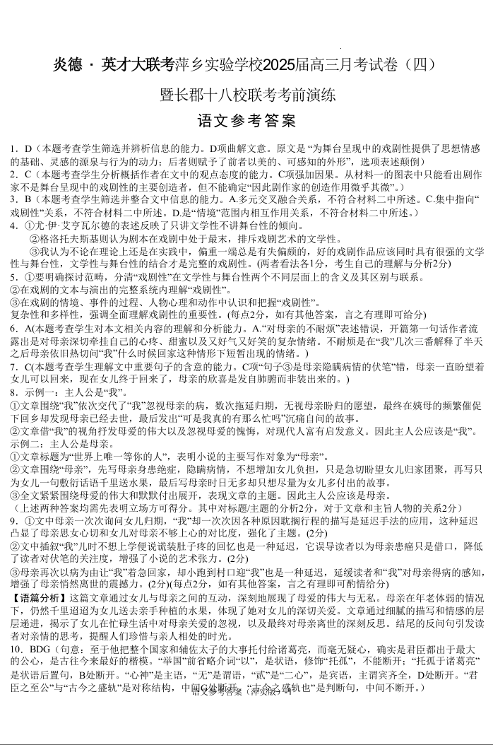 江西省萍乡实验学校2025届高三月考试卷(四)暨长郡十八校联考考前演练语文答案