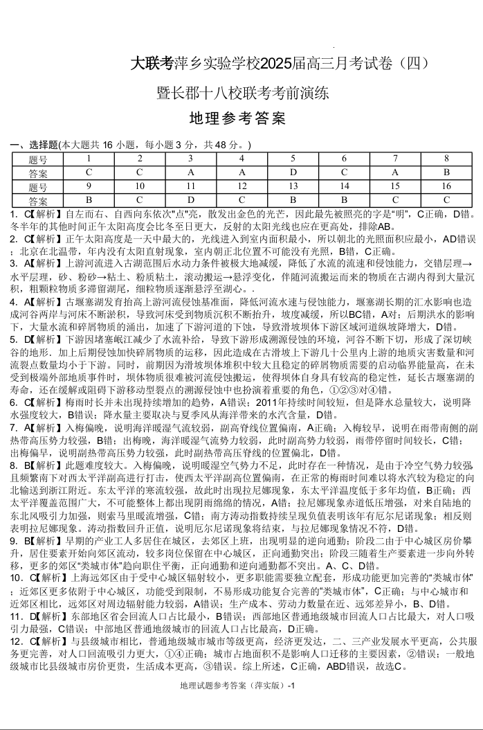 江西省萍乡实验学校2025届高三月考试卷(四)暨长郡十八校联考考前演练地理答案