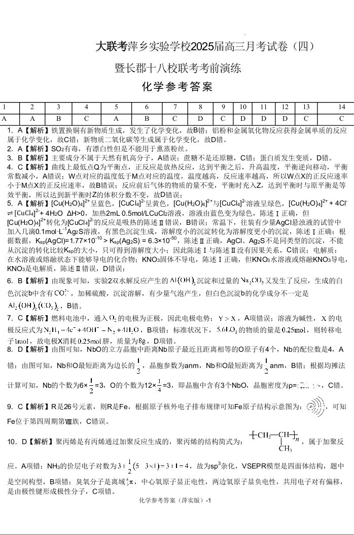 江西省萍乡实验学校2025届高三月考试卷(四)暨长郡十八校联考考前演练化学答案