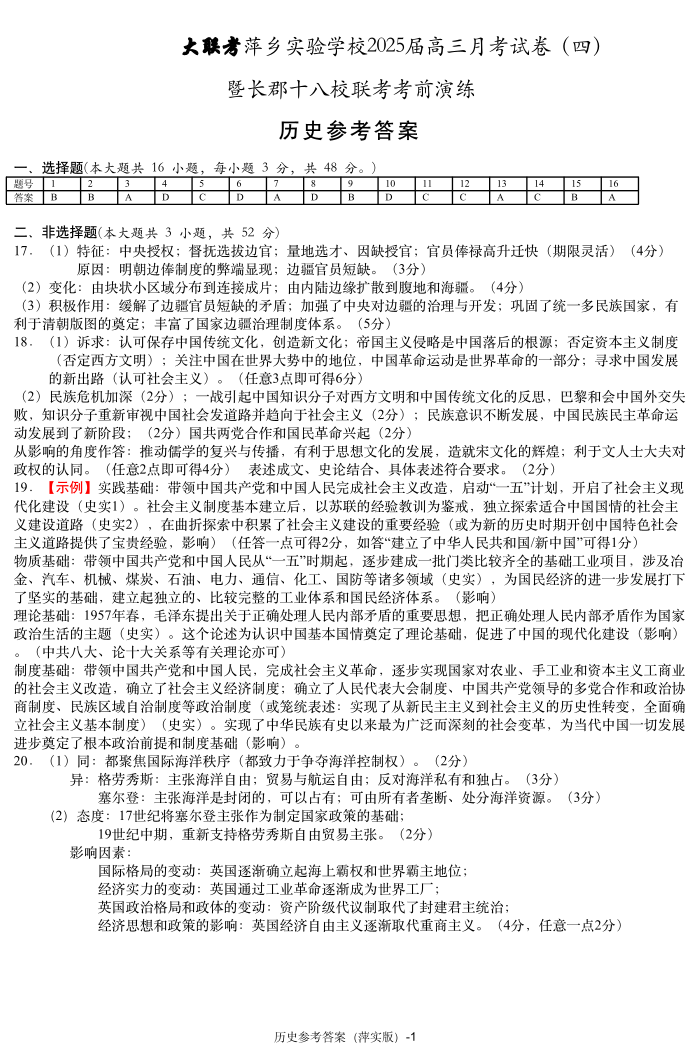 江西省萍乡实验学校2025届高三月考试卷(四)暨长郡十八校联考考前演练历史答案