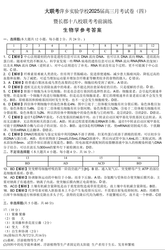 江西省萍乡实验学校2025届高三月考试卷(四)暨长郡十八校联考考前演练生物答案
