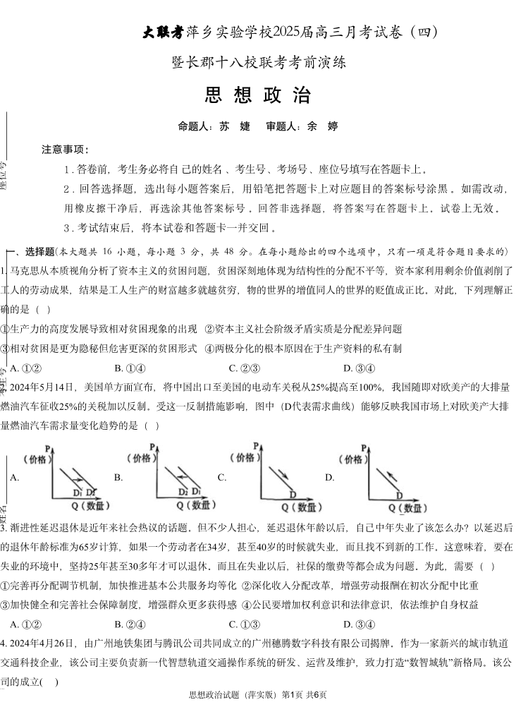 江西省萍乡实验学校2025届高三月考试卷(四)暨长郡十八校联考考前演练政治