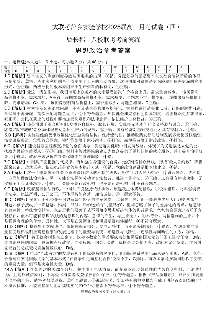江西省萍乡实验学校2025届高三月考试卷(四)暨长郡十八校联考考前演练政治答案