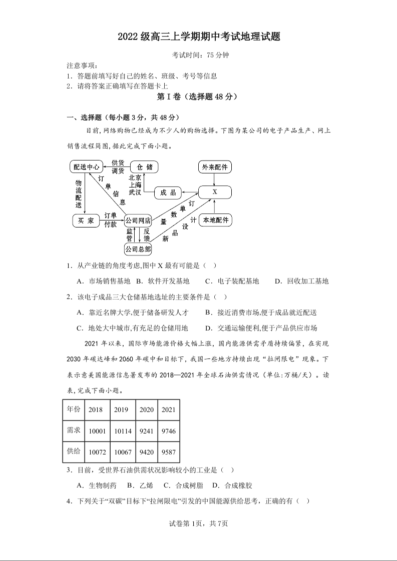 四川省仁寿第一中学校南校区2022级高三上学期期中考试地理