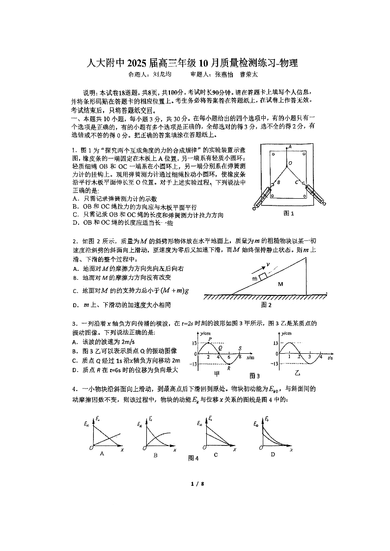 北京市中国人民大学附属中学2025届高三年级10月质量检测练习物理答案