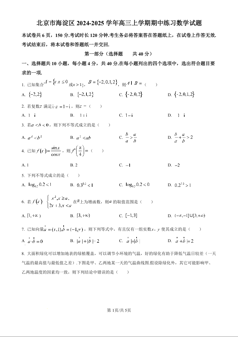 北京市海淀区2025届高三上学期期中考试数学(原卷版)