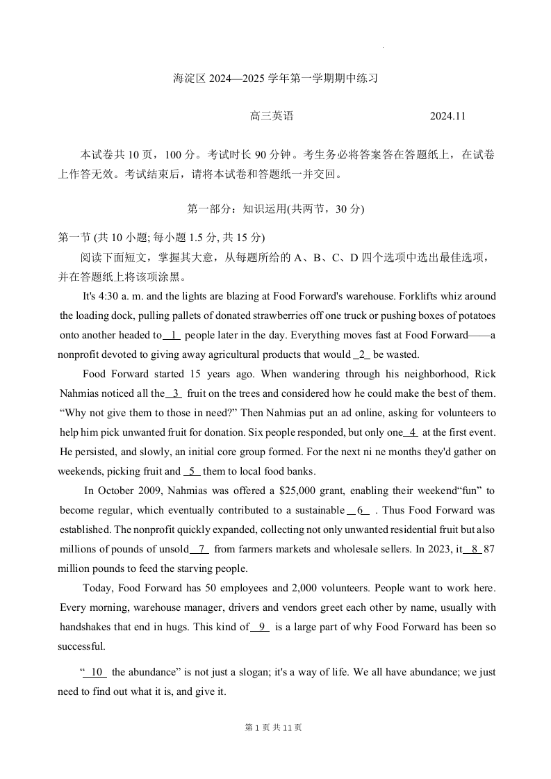 北京市海淀区2025届高三上学期期中考试英语