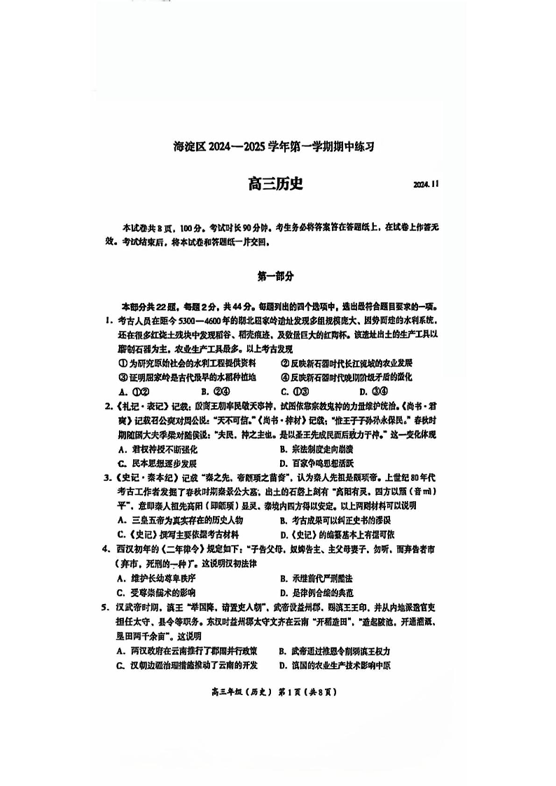 北京市海淀区2024-2025学年高三上学期期中练习历史