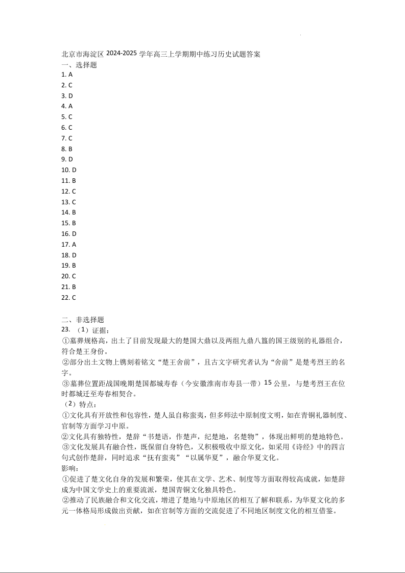 北京市海淀区2024-2025学年高三上学期期中练习历史答案