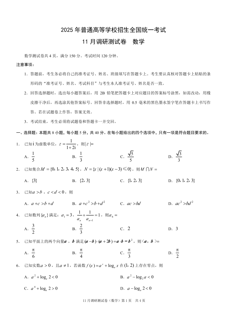 2025年重庆市普通高中学业水平选择性考试11月调研测试卷数学