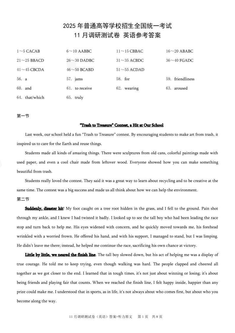 2025年重庆市普通高中学业水平选择性考试11月调研测试卷英语答案
