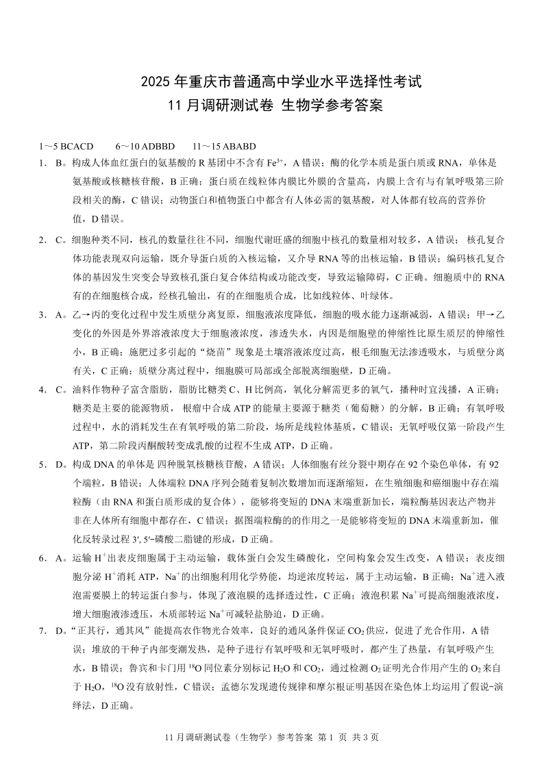 2025年重庆市普通高中学业水平选择性考试11月调研测试卷生物答案