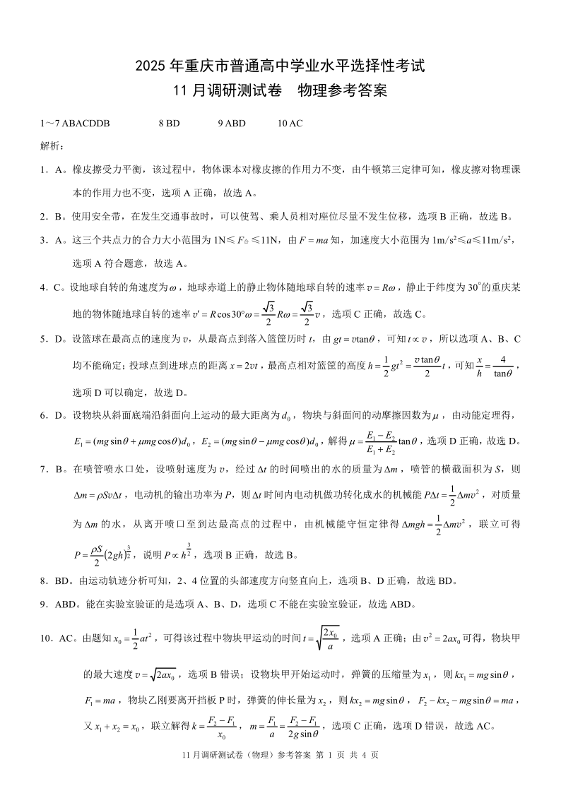 2025年重庆市普通高中学业水平选择性考试11月调研测试卷物理答案
