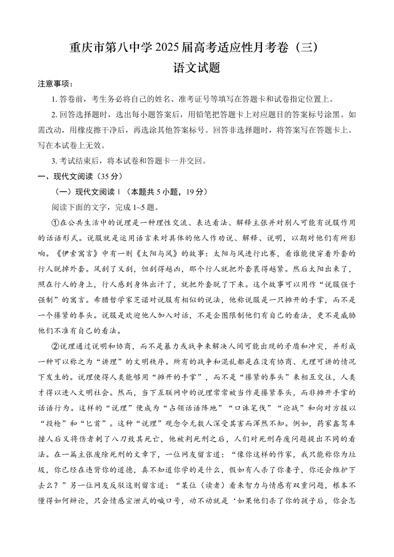 重庆市第八中学2025届高考适应性月考卷(三)语文