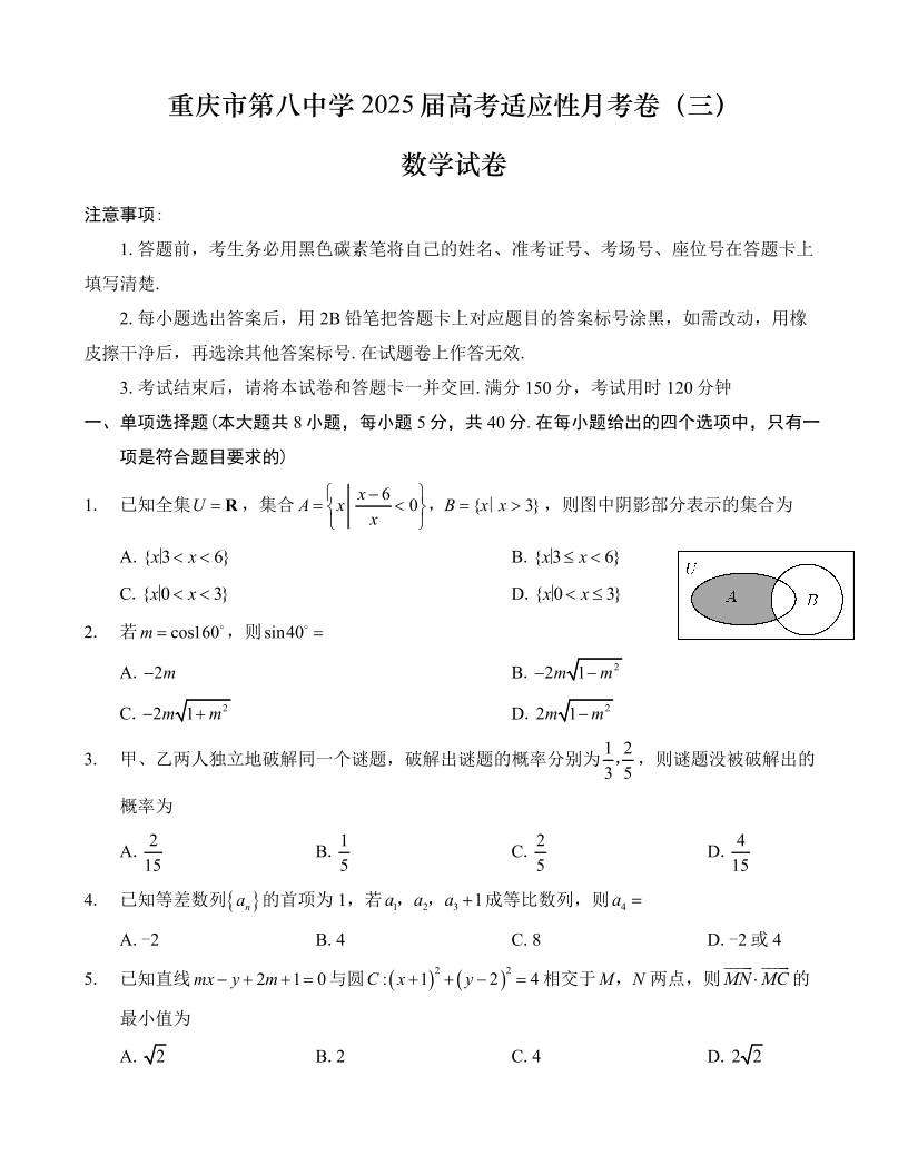 重庆市第八中学2025届高考适应性月考卷(三)数学