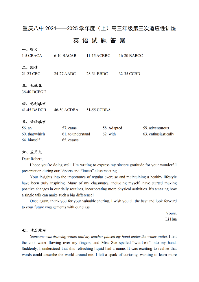 重庆市第八中学2025届高考适应性月考卷(三)英语答案