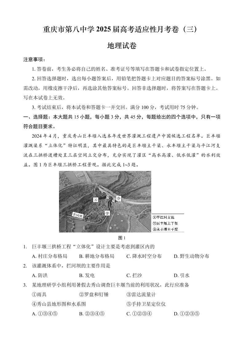 重庆市第八中学2025届高考适应性月考卷(三)地理