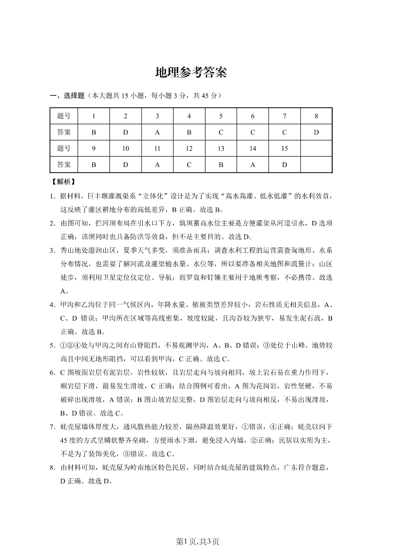 重庆市第八中学2025届高考适应性月考卷(三)地理答案