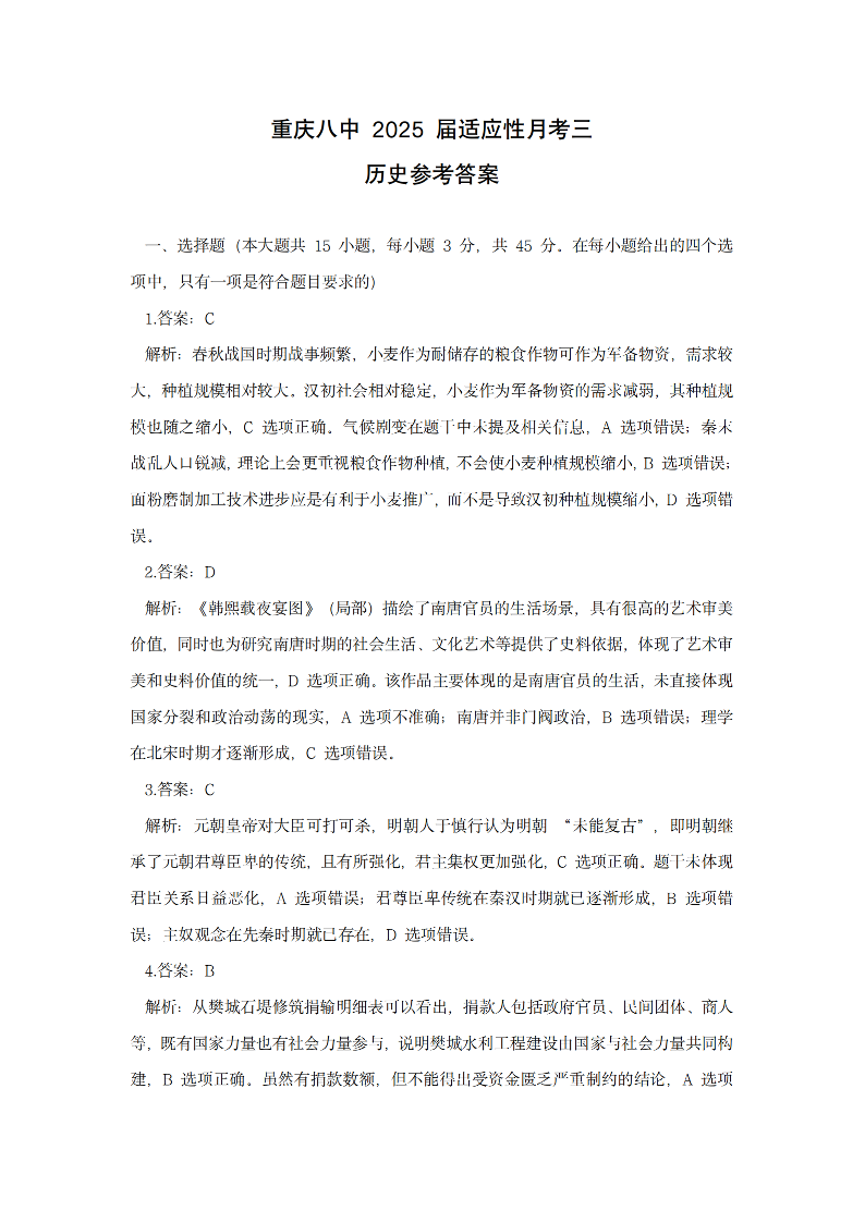 重庆市第八中学2025届高考适应性月考卷(三)历史答案