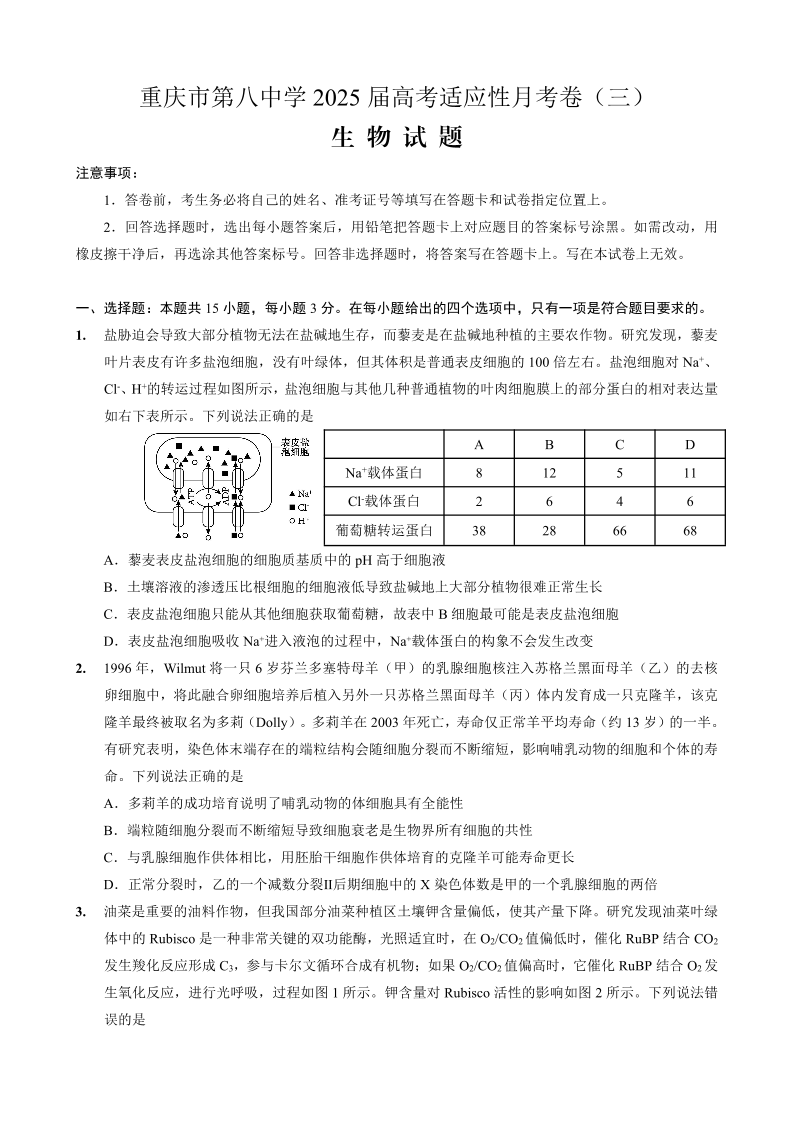 重庆市第八中学2025届高考适应性月考卷(三)生物