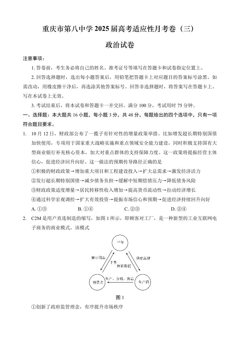 重庆市第八中学2025届高考适应性月考卷(三)政治