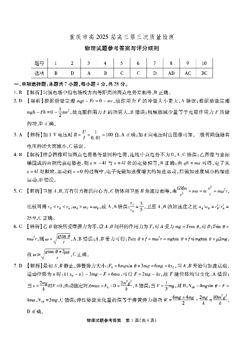 重庆市南开中学高2025届高三第三次质量检物理答案