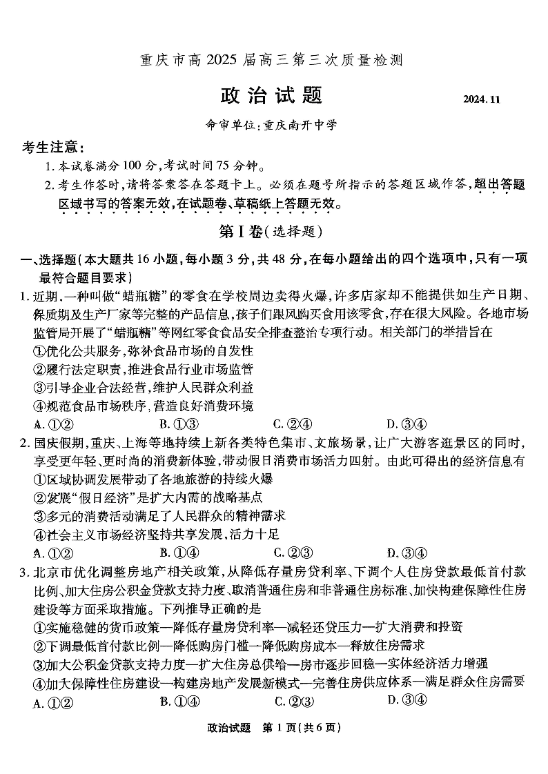 重庆市南开中学高2025届高三第三次质量检政治