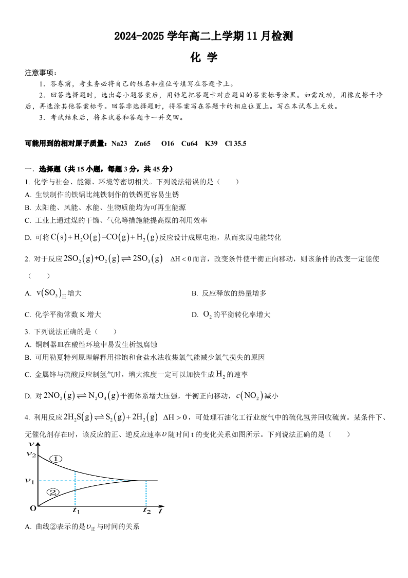 河南省安阳市林州市第一中学2024-2025学年高二上学期11月检测 化学及答案