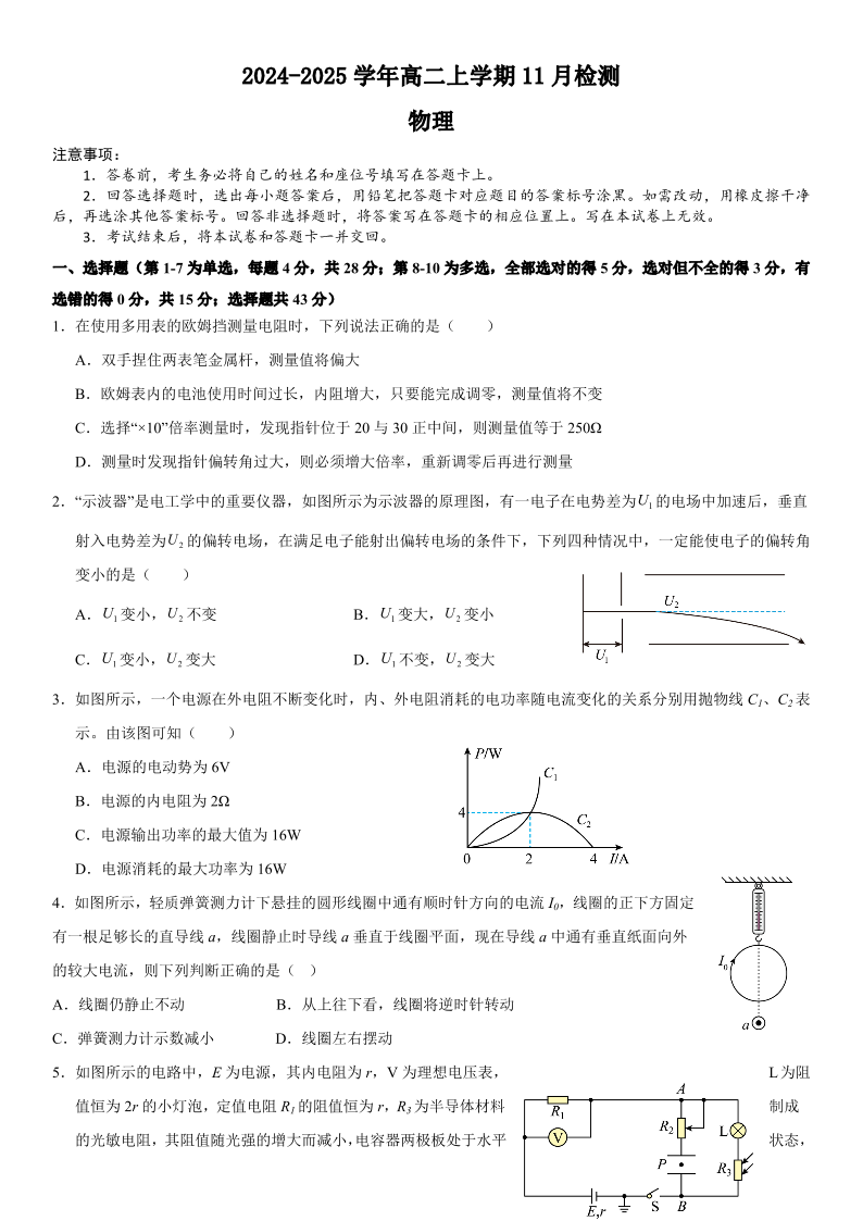 河南省安阳市林州市第一中学2024-2025学年高二上学期11月检测 物理及答案