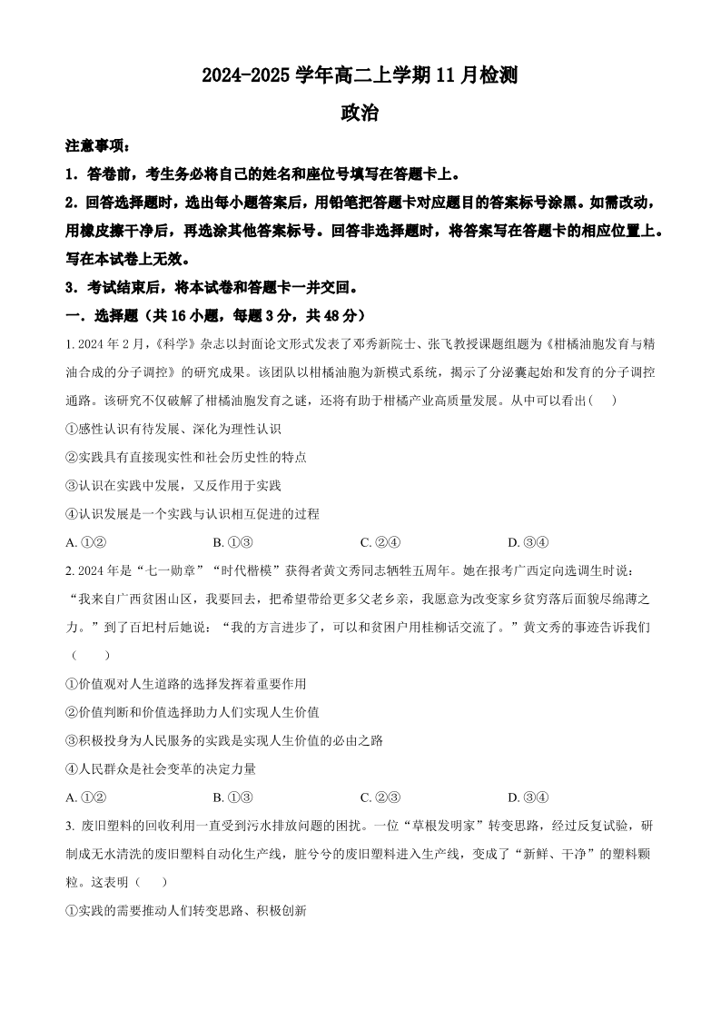 河南省安阳市林州市第一中学2024-2025学年高二上学期11月检测 政治及答案